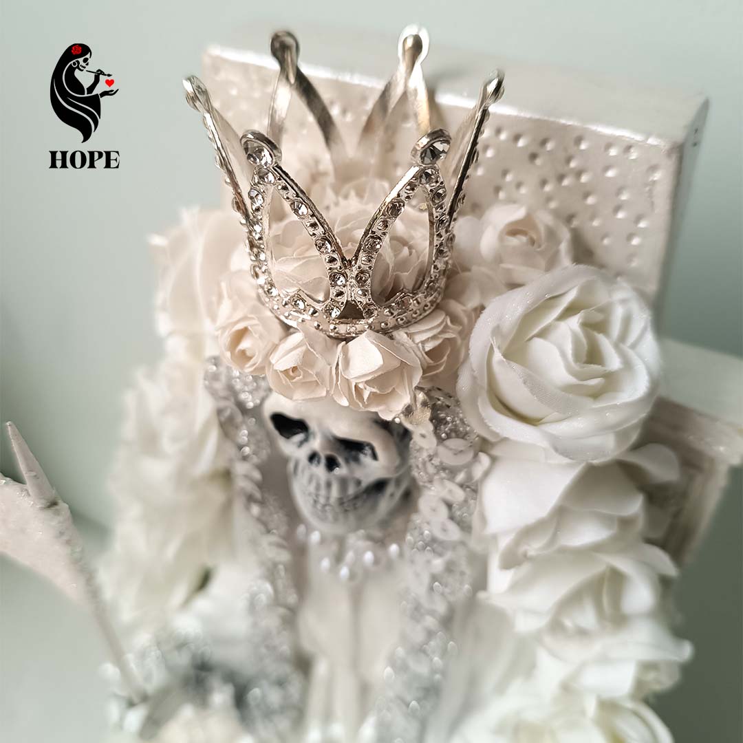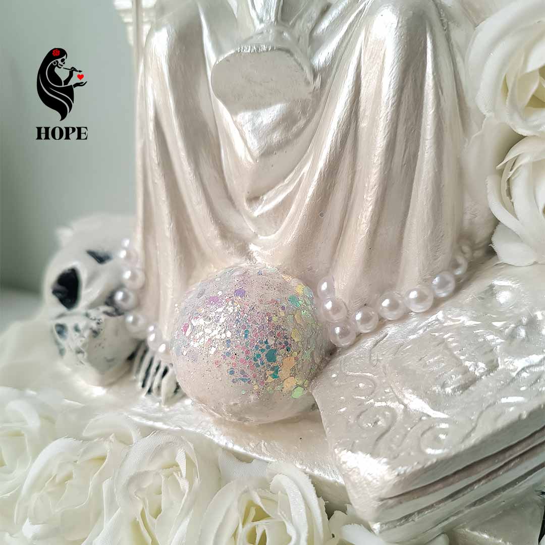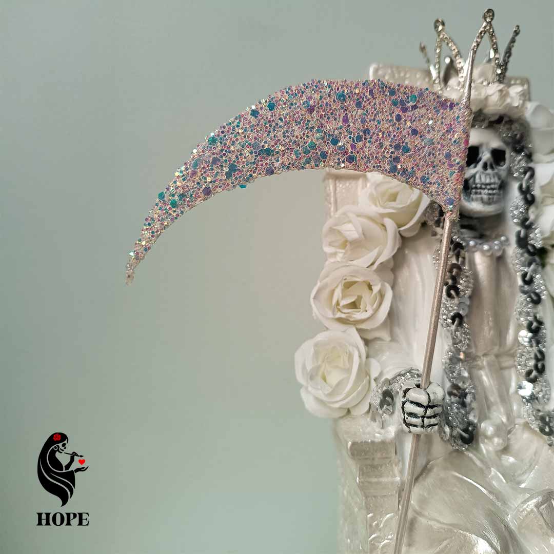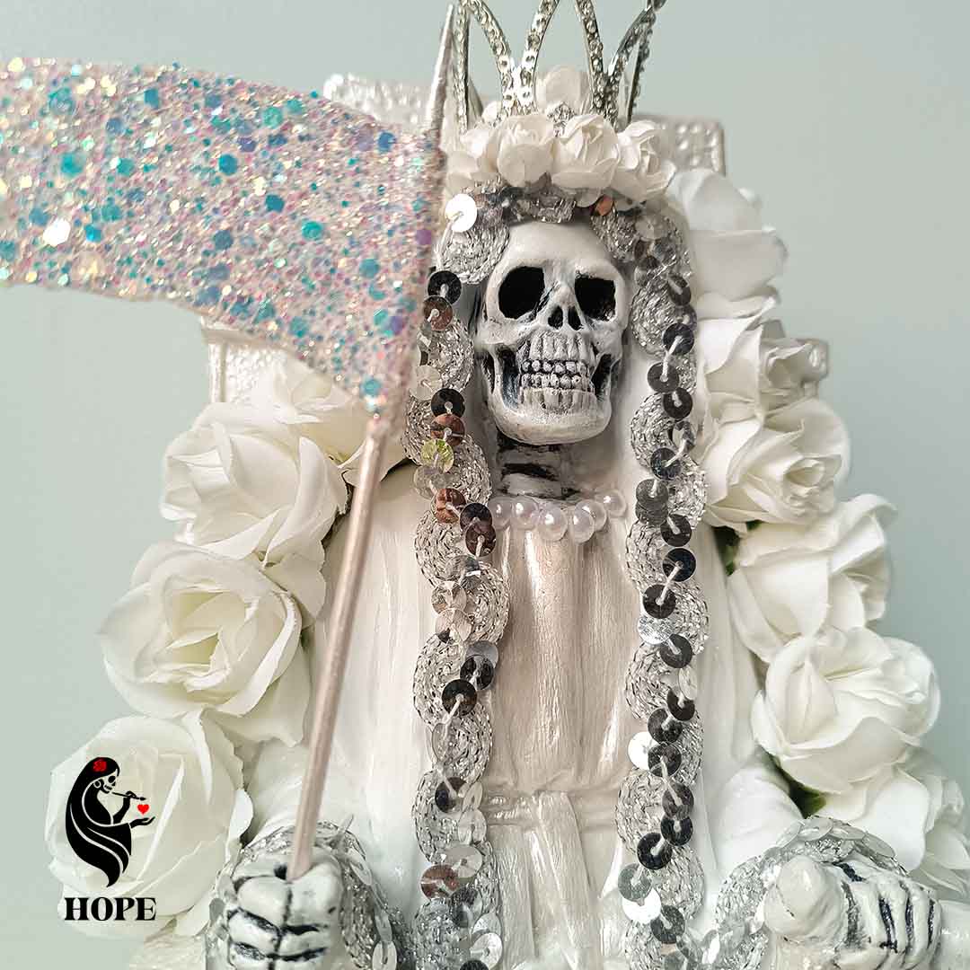 La Santa Muerte Blanca es conocida como la más pura y protectora, asociada con nuevos comienzos, armonía, sanación y claridad mental. Es ideal para peticiones de salud, tranquilidad familiar y para abrir caminos alejando toda energía negativa.