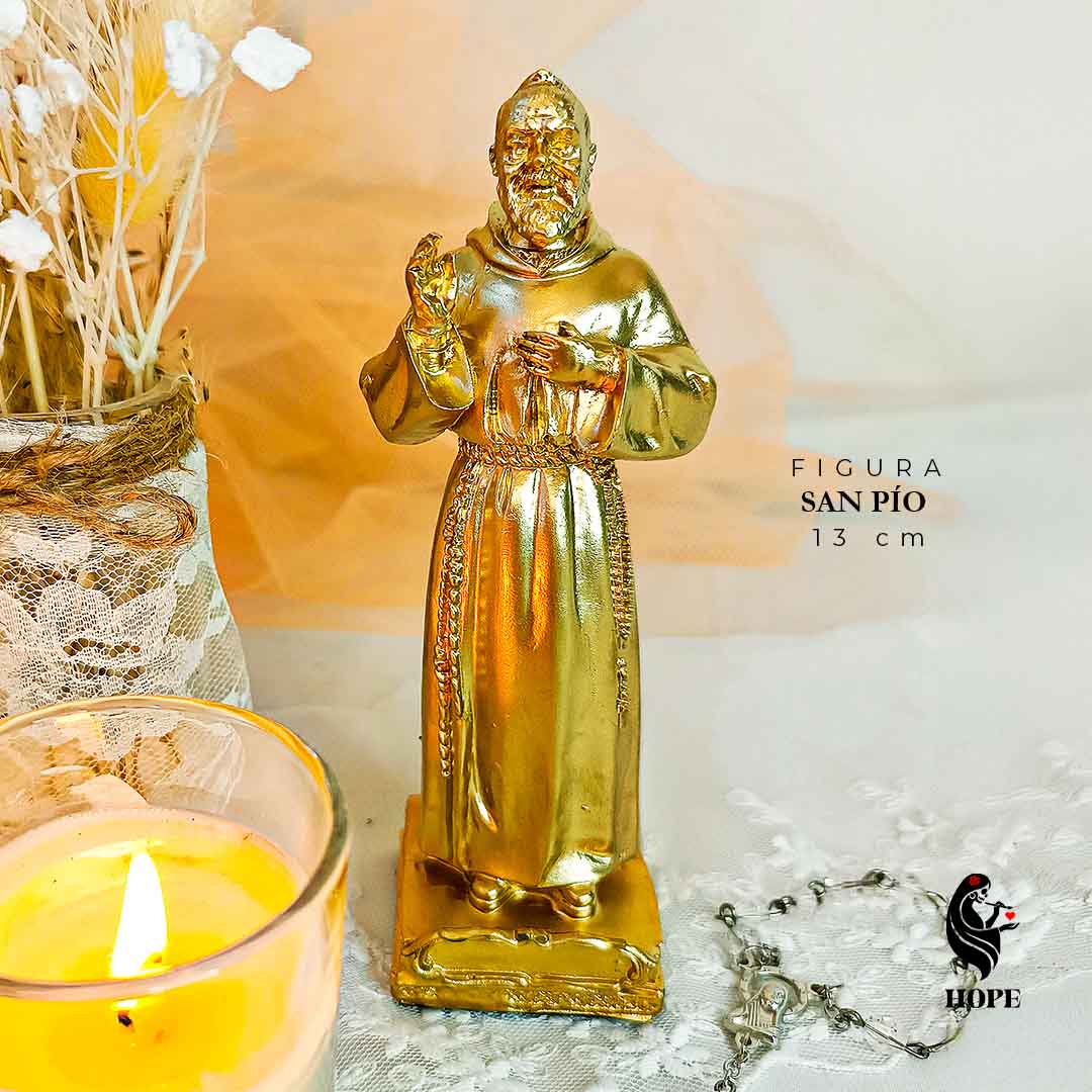 Esta hermosa figura representa a San Pío de Pietrelcina, también conocido como Padre Pío, un santo muy querido por su vida de entrega, fe y milagros. La figura tiene un efecto oro cromado que le otorga un aspecto solemne y decorativo.