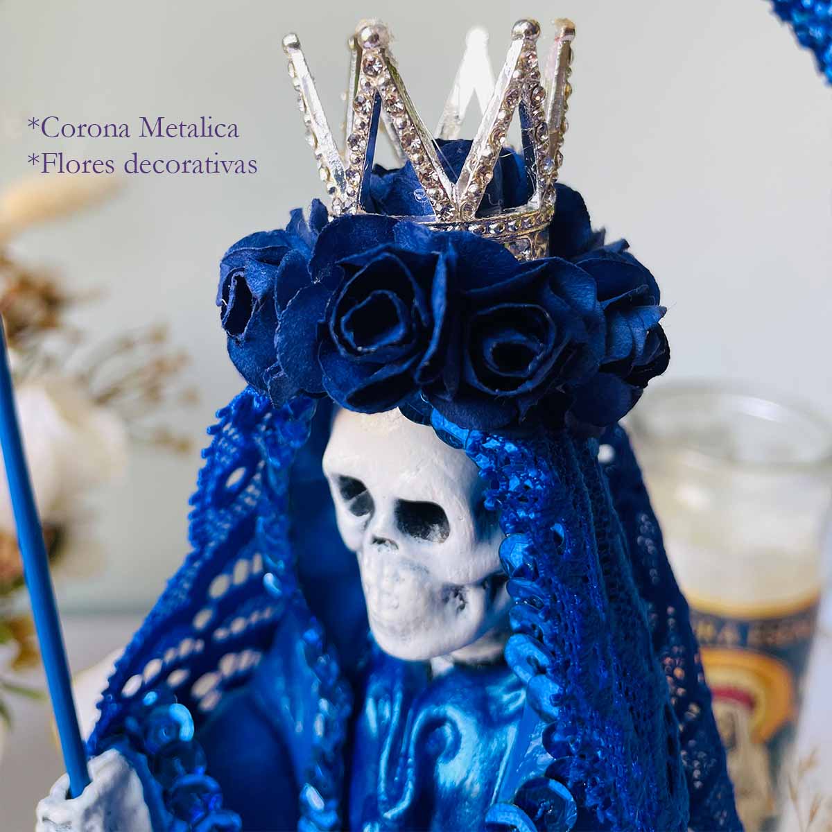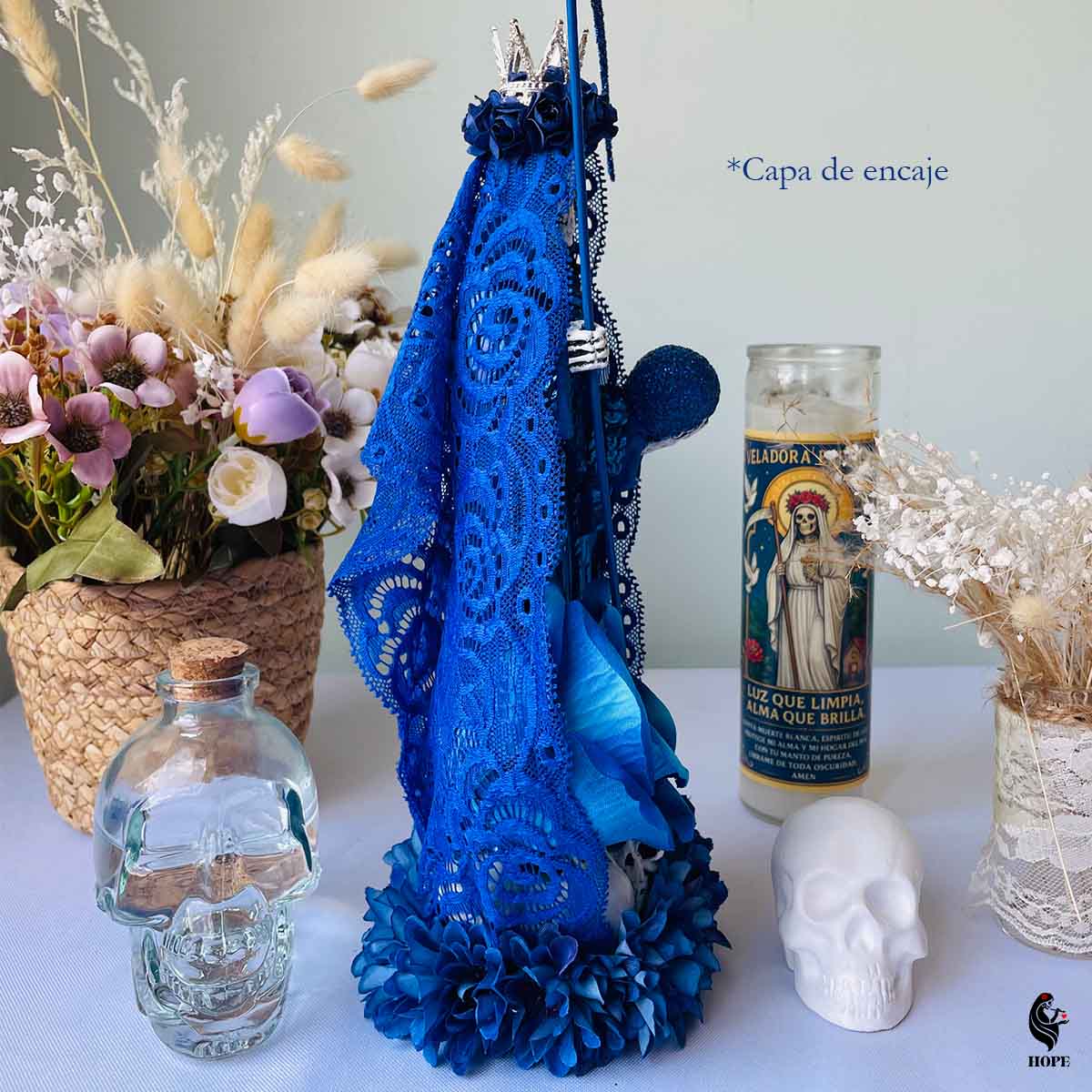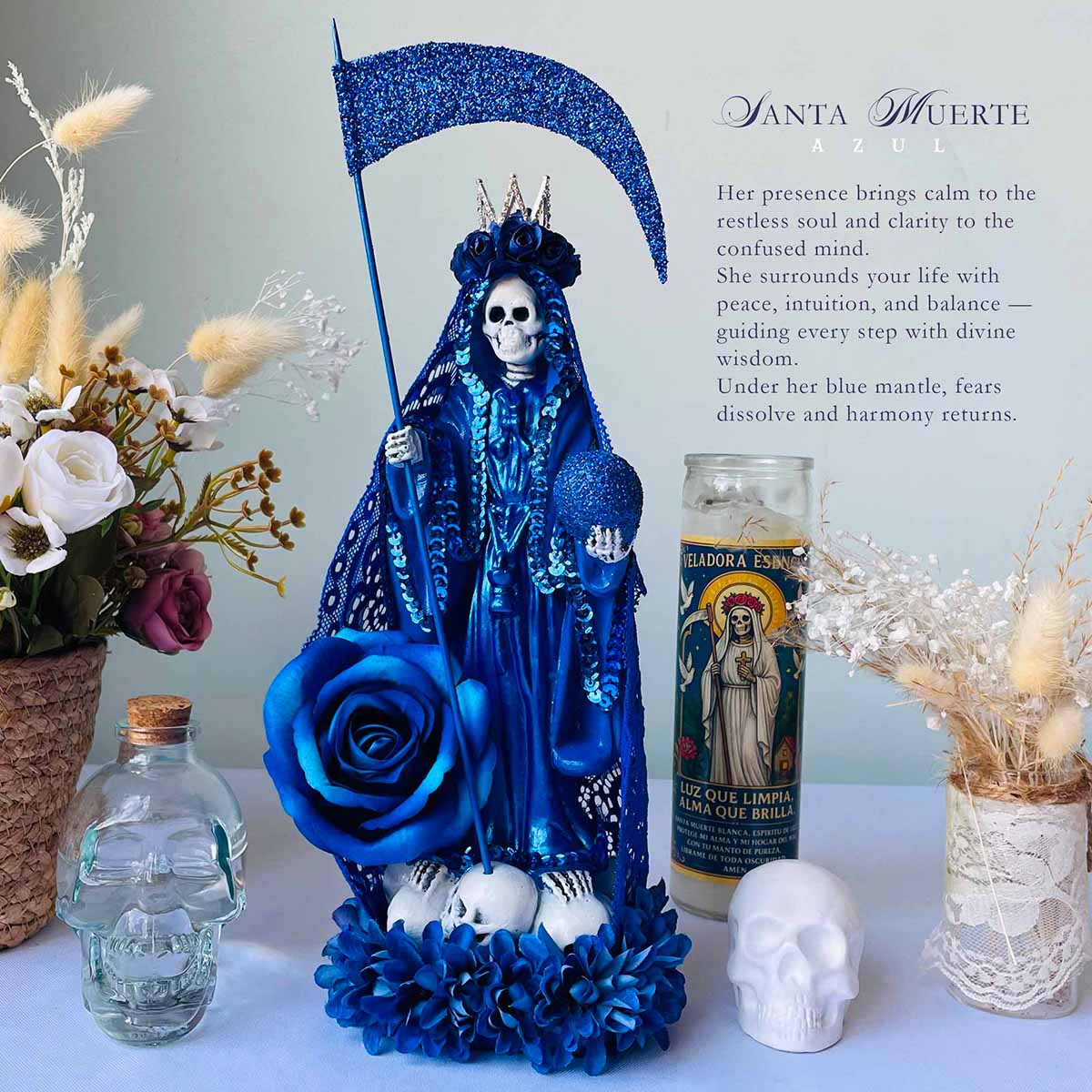 Conecta con el poder de la Santa Muerte en color azul y hazla parte de tu vida hoy.