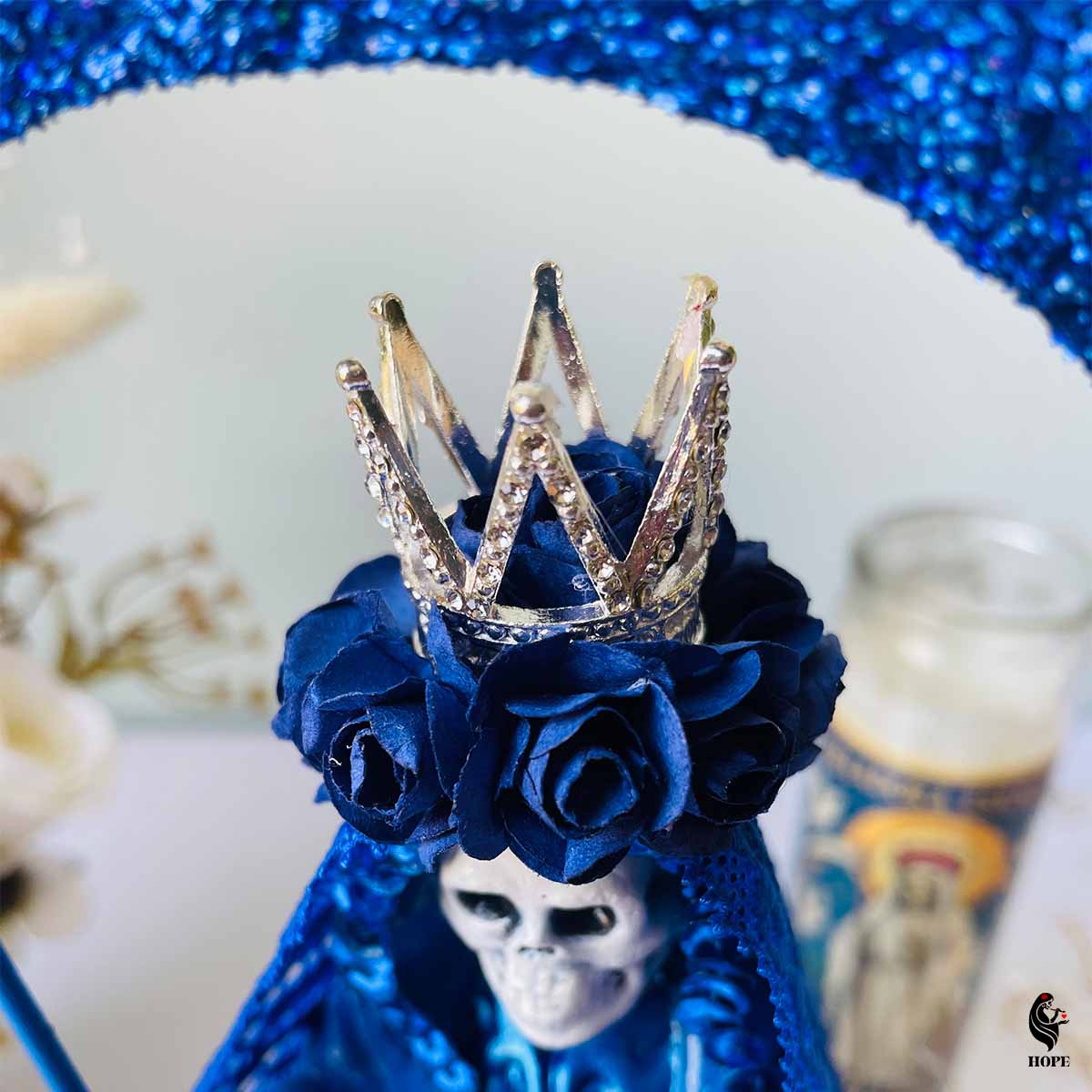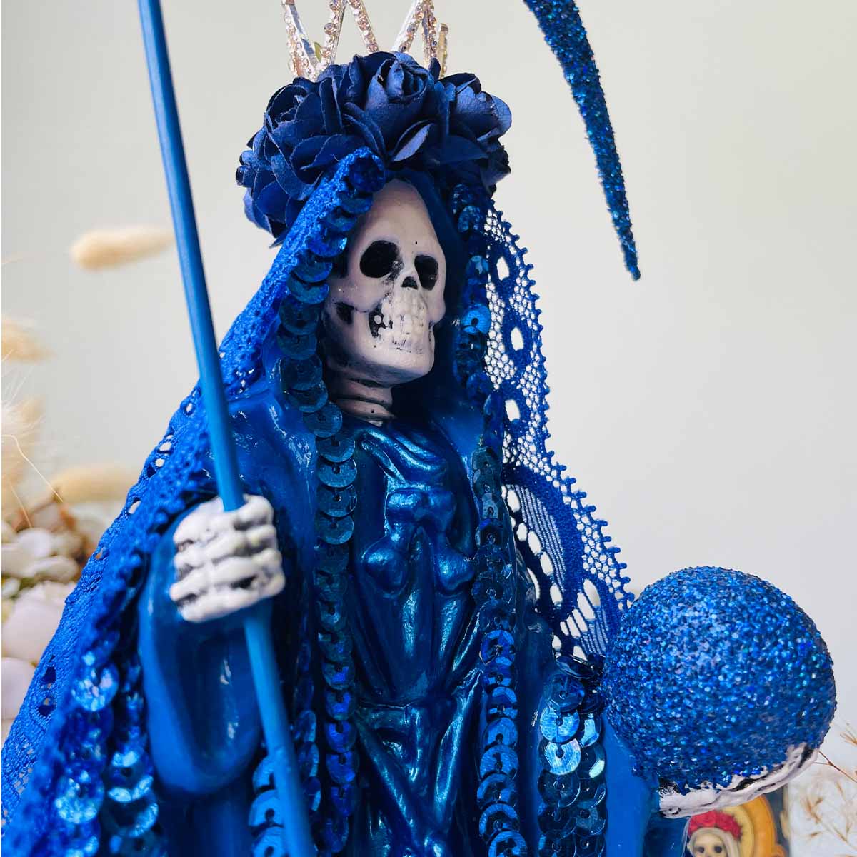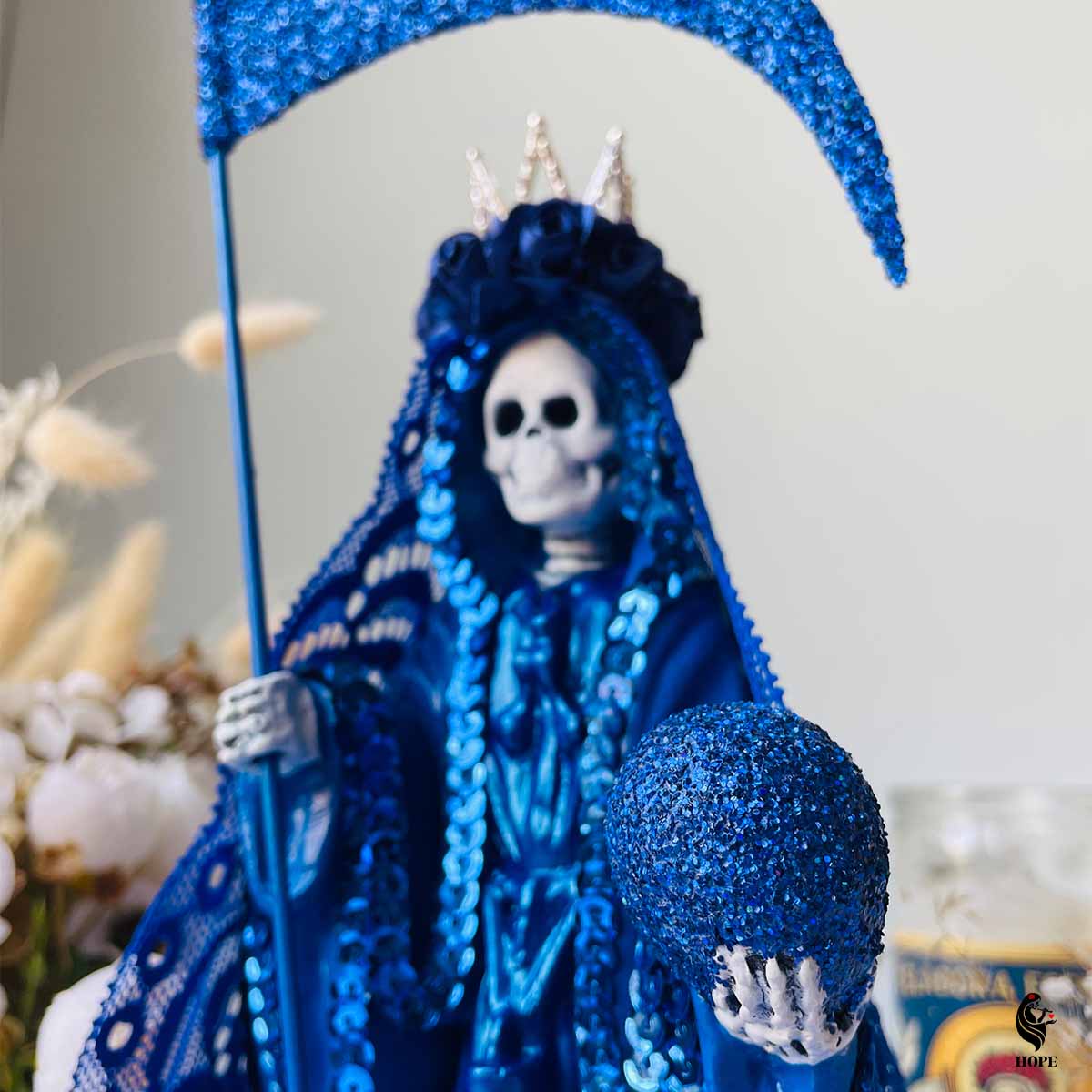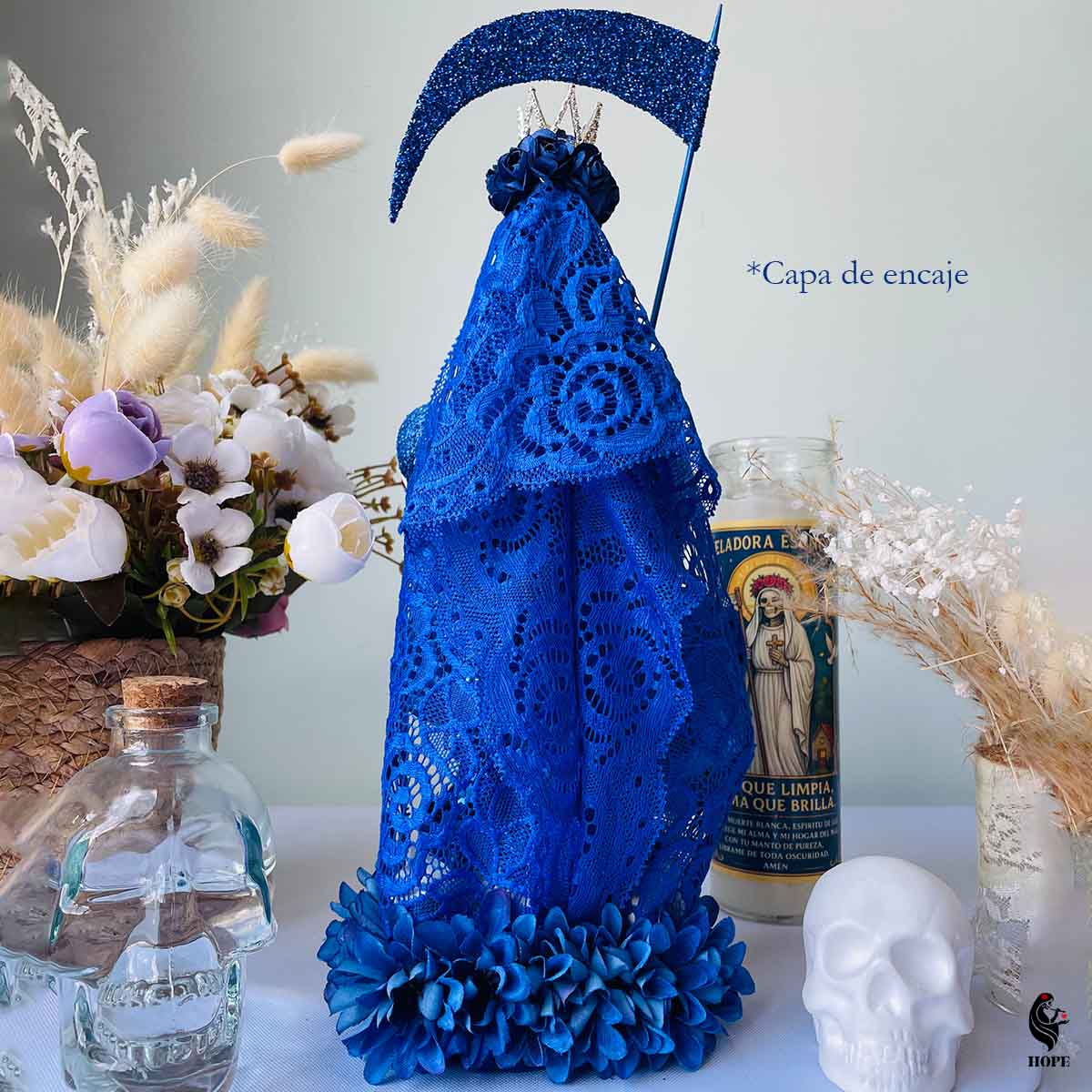 Conecta con el poder de la Santa Muerte en color azul y hazla parte de tu vida hoy.