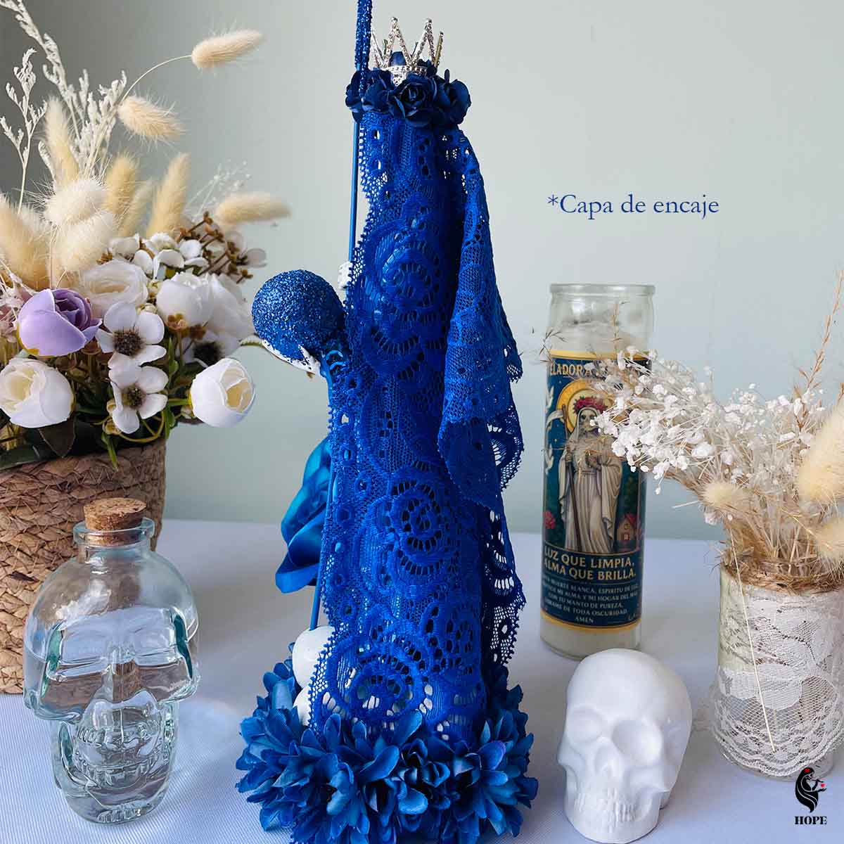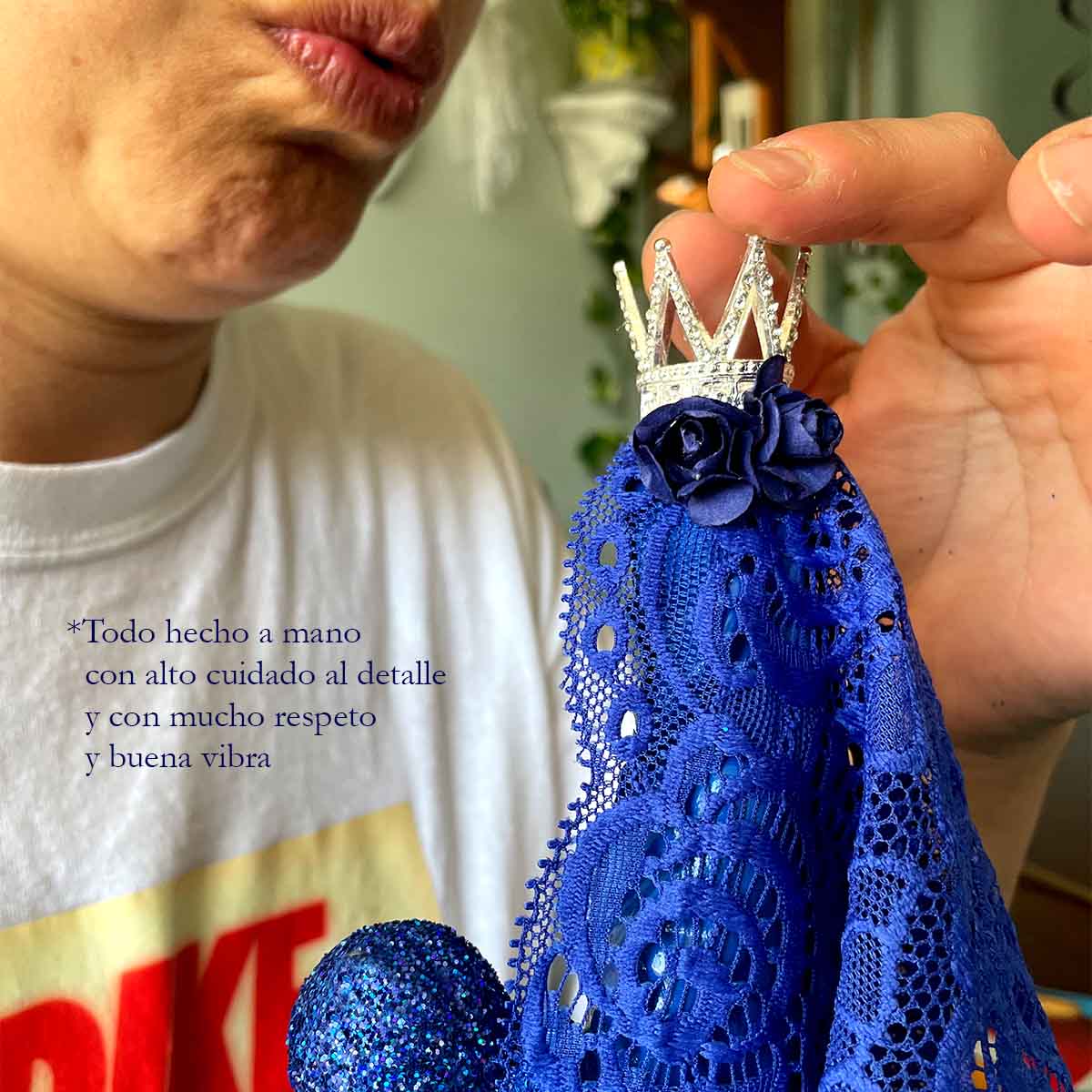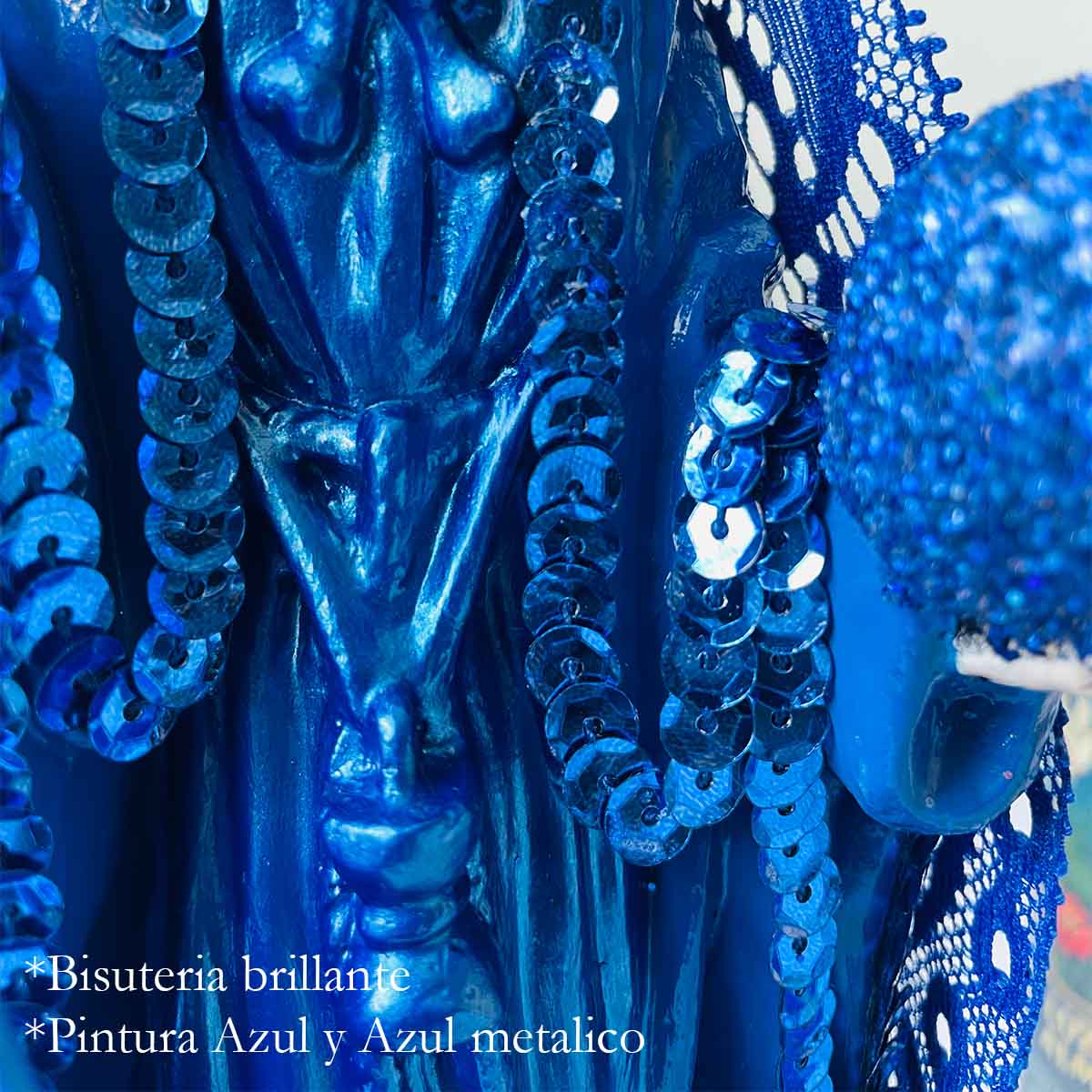 • Acabado: Pintura de alta calidad con tonos azules profundos y detalles en bisutería, flores y su exclusiva corona que resaltan su elegancia y misticismo.