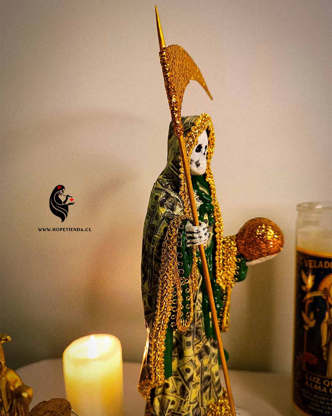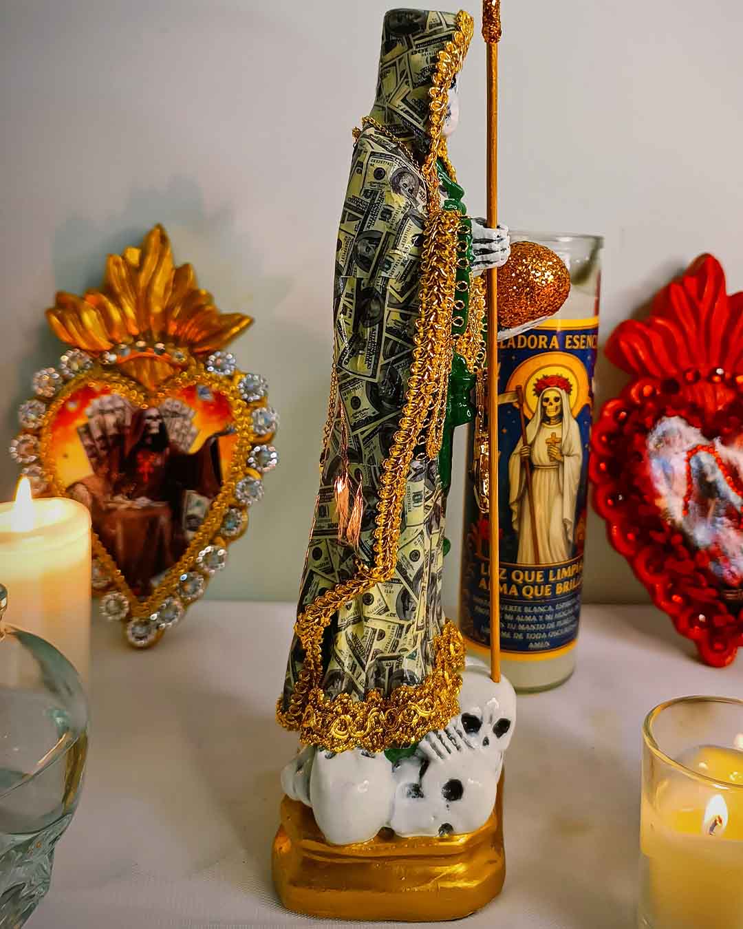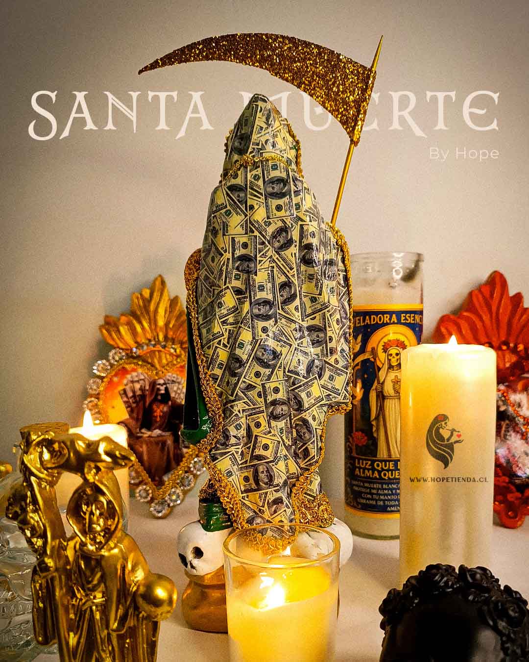 El manto cubierto de dólares simboliza la abundancia, el dinero que fluye y las oportunidades que se abren en el camino. Los tonos dorados representan la luz, el éxito y la prosperidad que muchos buscan en su vida. La esfera dorada en su mano refleja el mundo material y la capacidad de dominarlo con fe y confianza, mientras que la guadaña es ese recordatorio de que todo lo que nos frena puede ser cortado para avanzar.