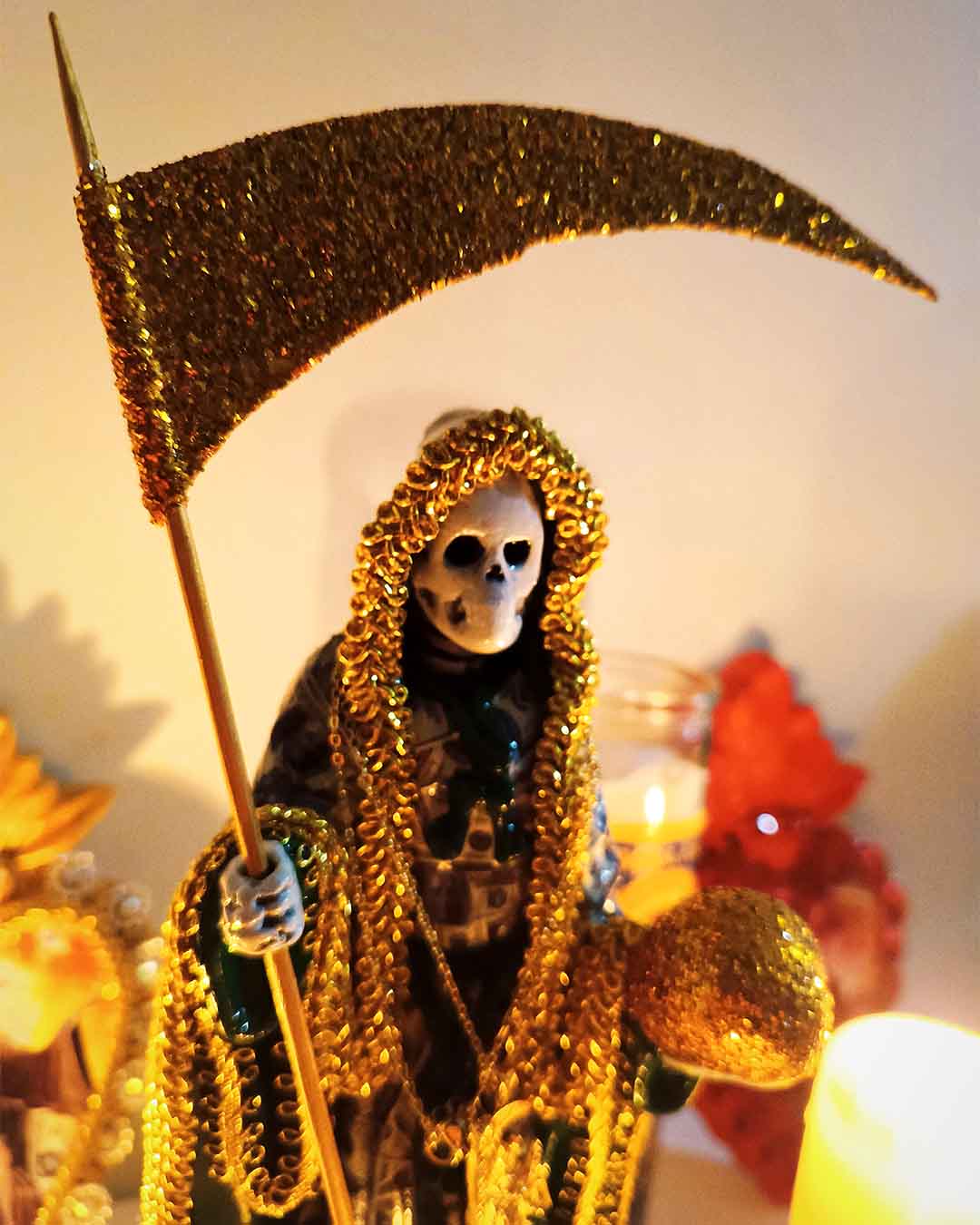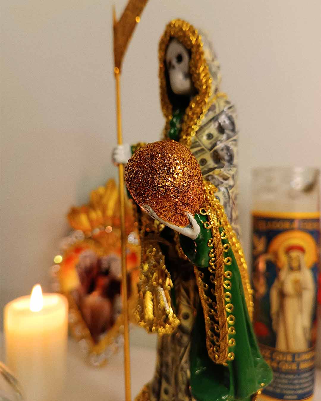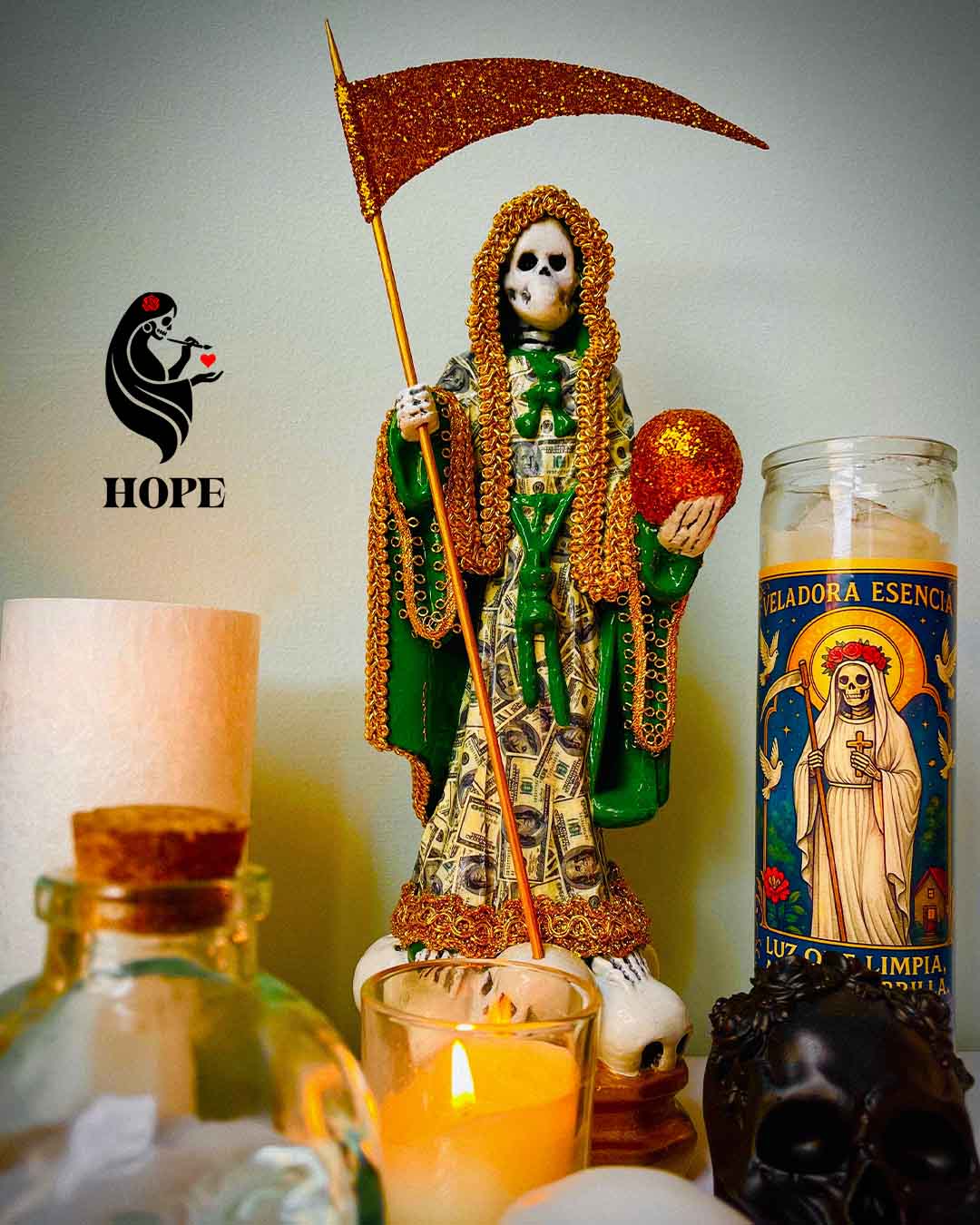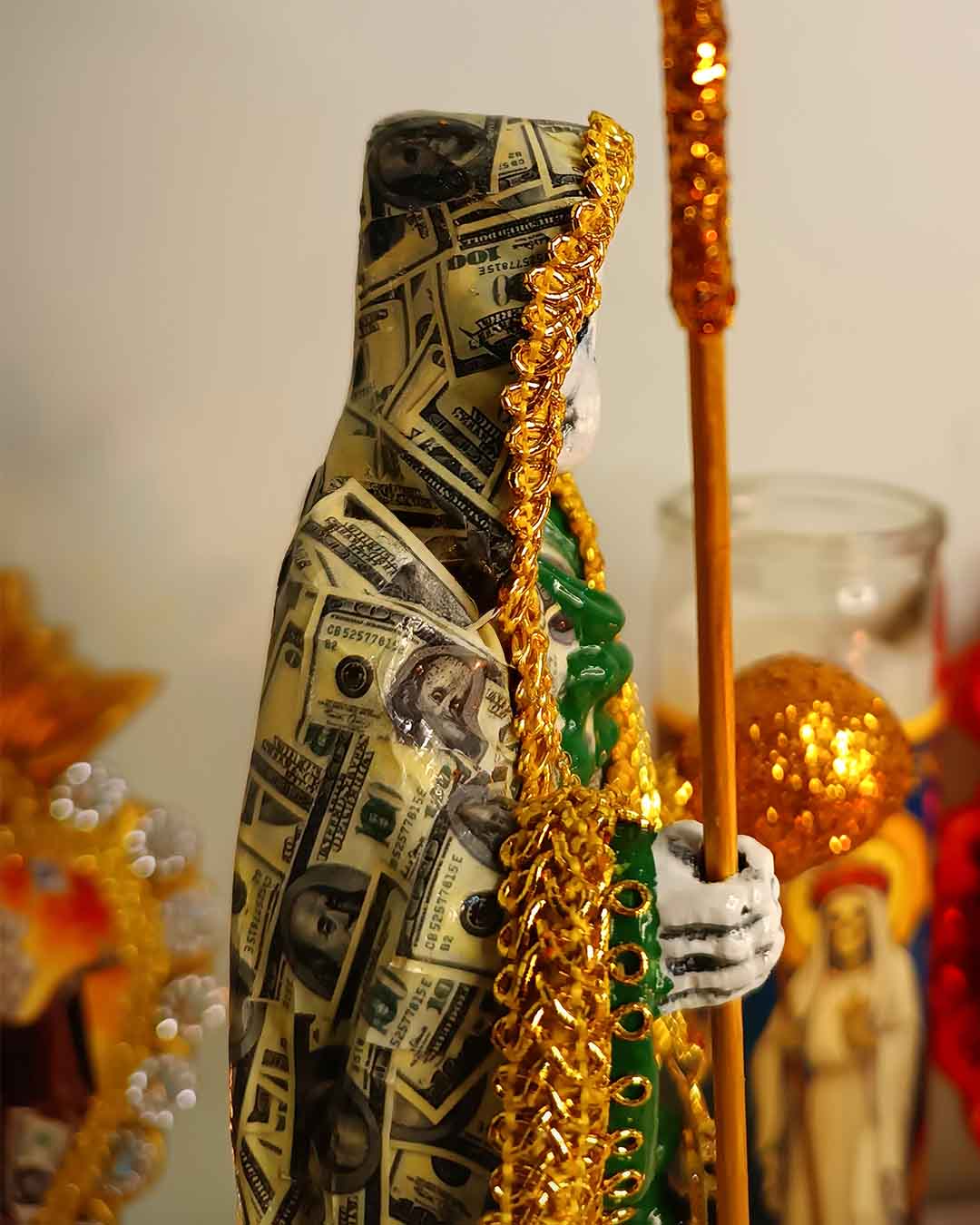 El manto cubierto de dólares simboliza la abundancia, el dinero que fluye y las oportunidades que se abren en el camino. Los tonos dorados representan la luz, el éxito y la prosperidad que muchos buscan en su vida. La esfera dorada en su mano refleja el mundo material y la capacidad de dominarlo con fe y confianza, mientras que la guadaña es ese recordatorio de que todo lo que nos frena puede ser cortado para avanzar.