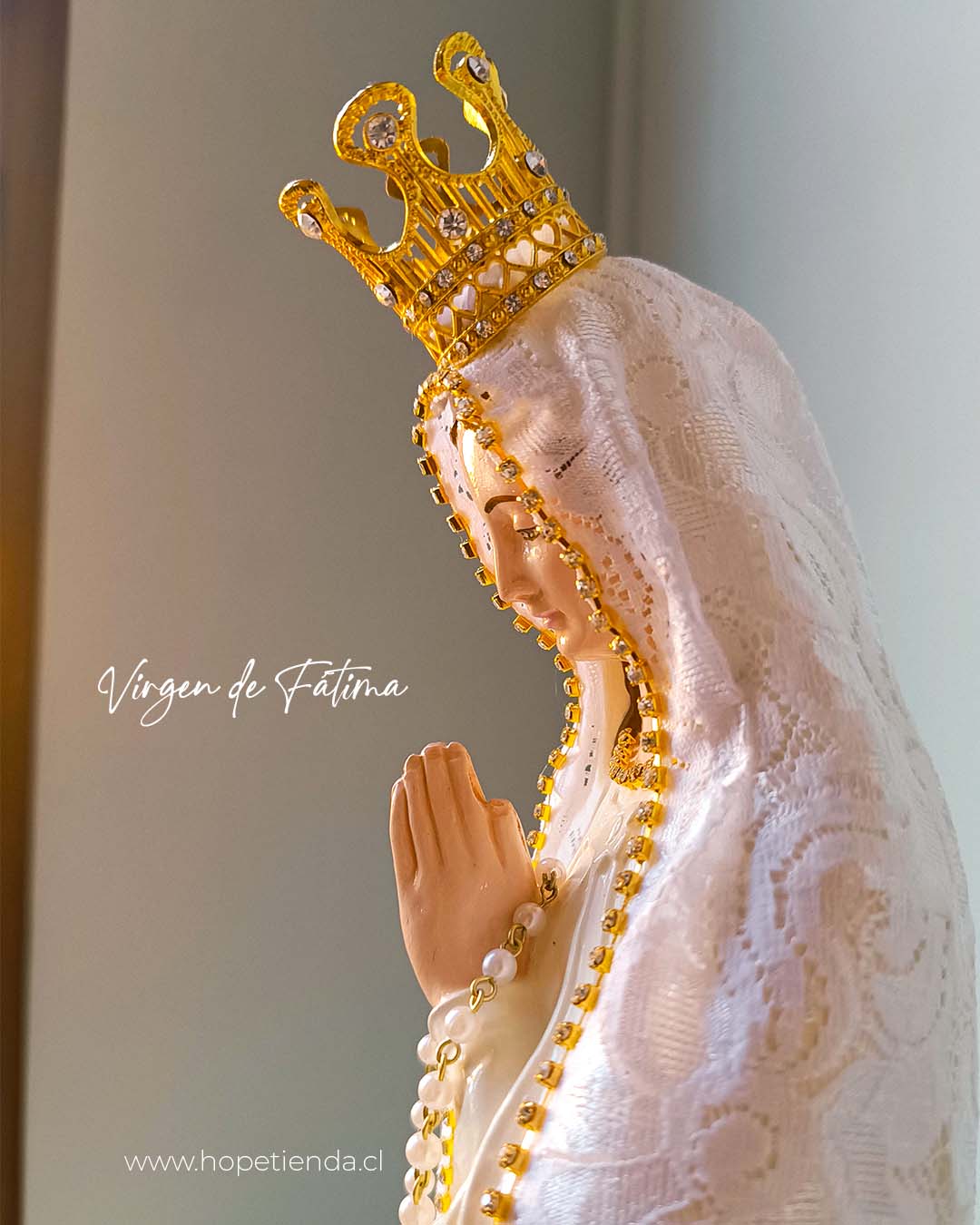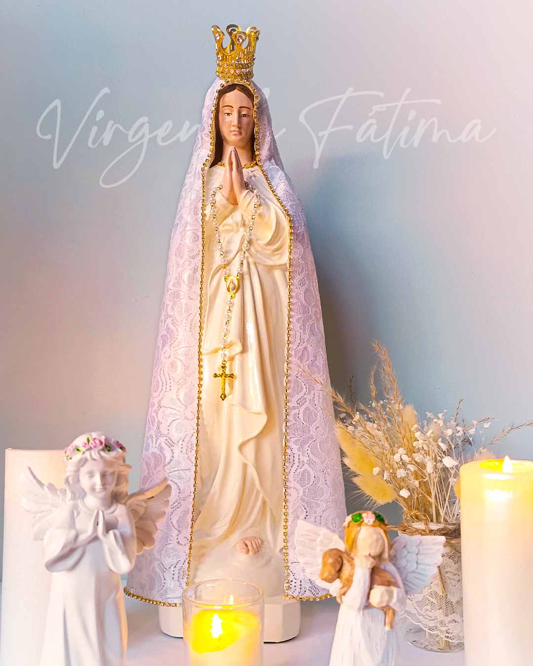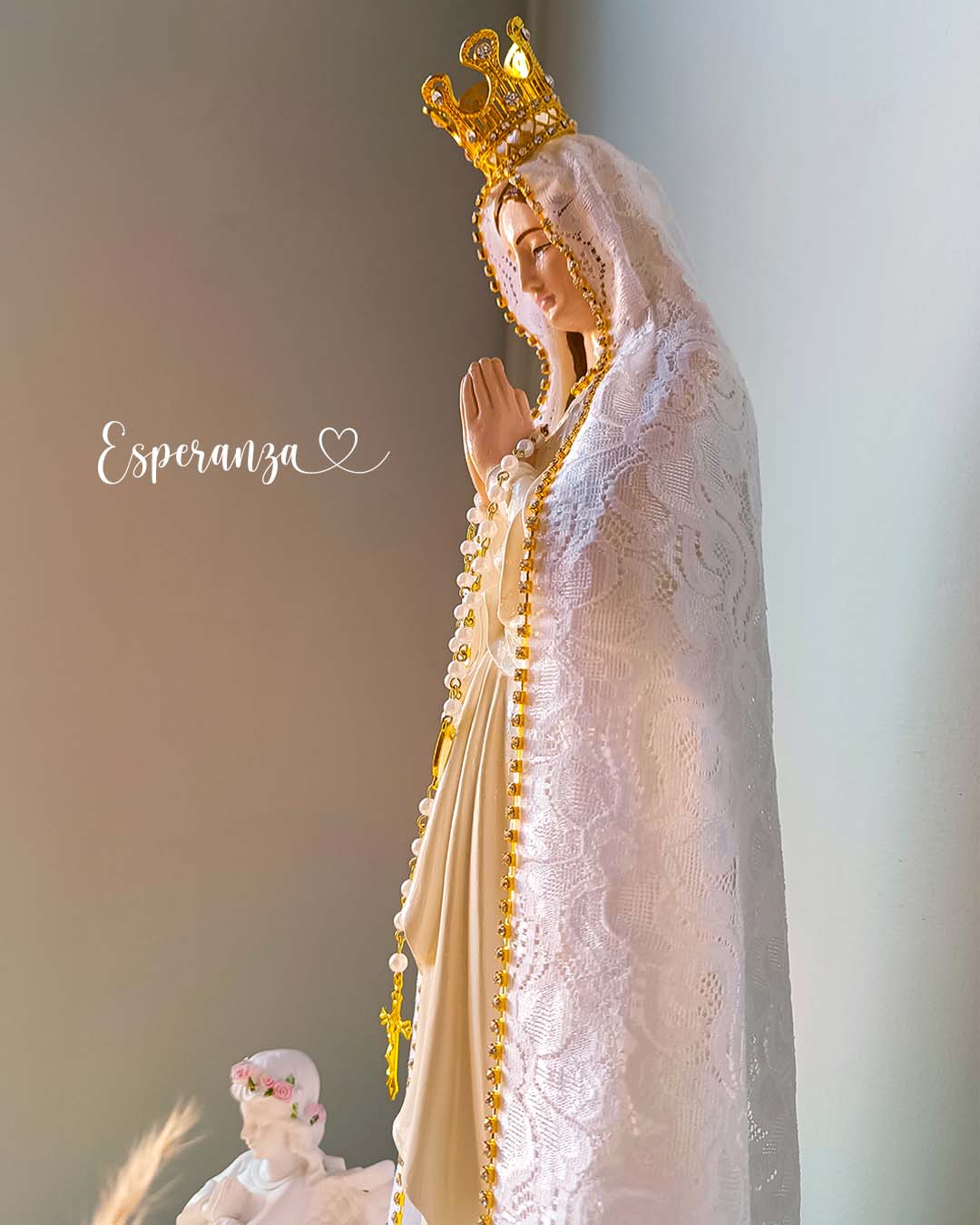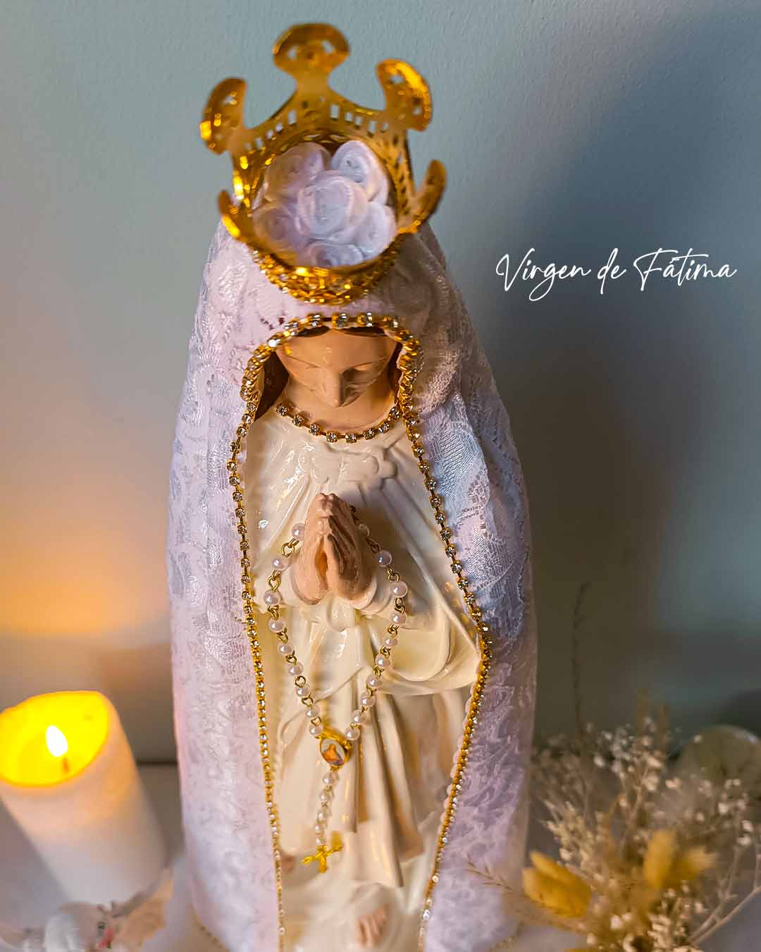 Cada Virgen que pinto y decoro lleva un pedacito de mí. Esta Virgen de Fátima de 48 cm la hice con mucho cariño, aplicando telas, bisutería y detalles que realzan su belleza.
