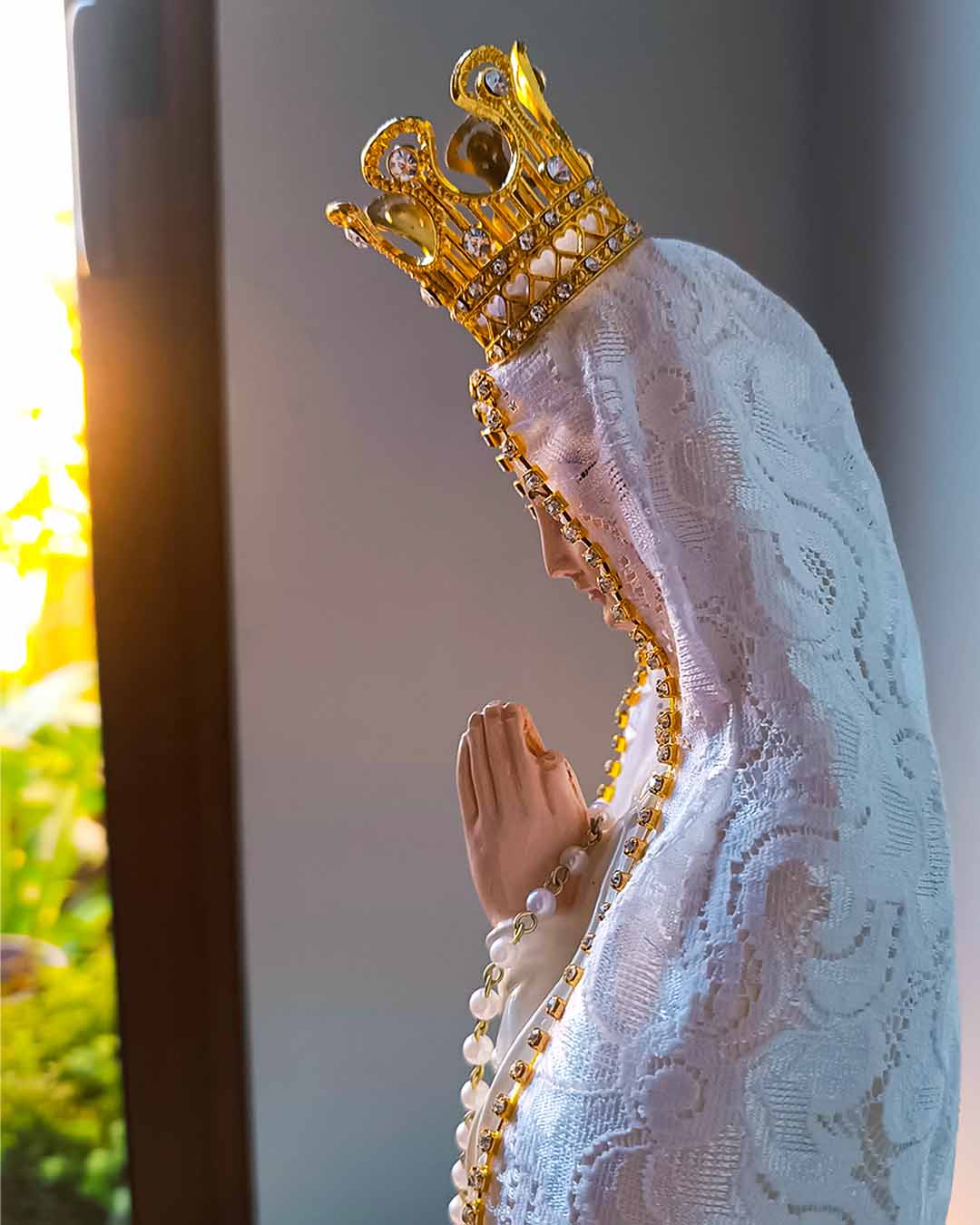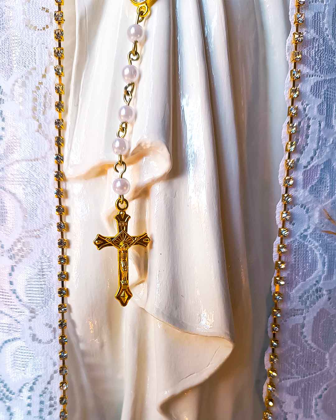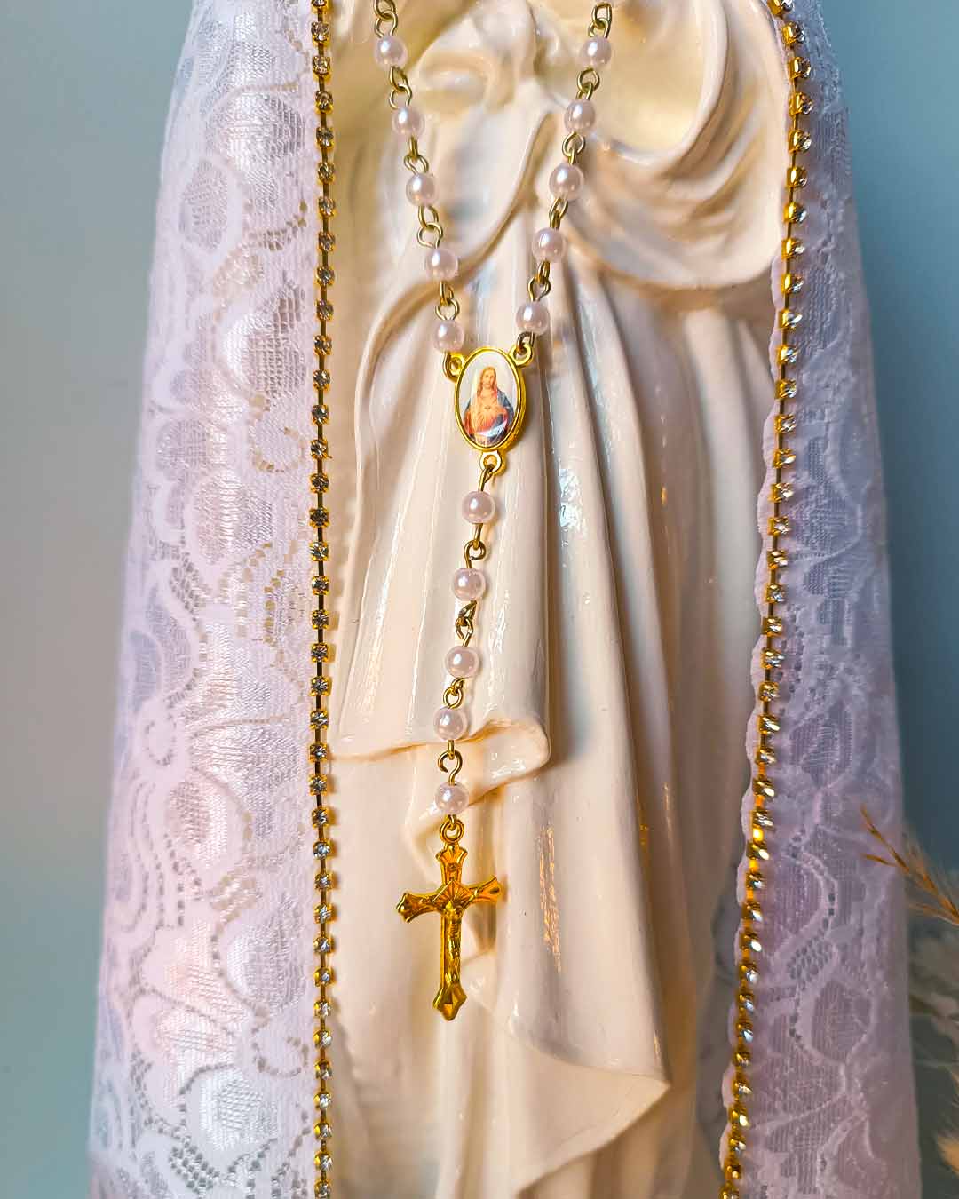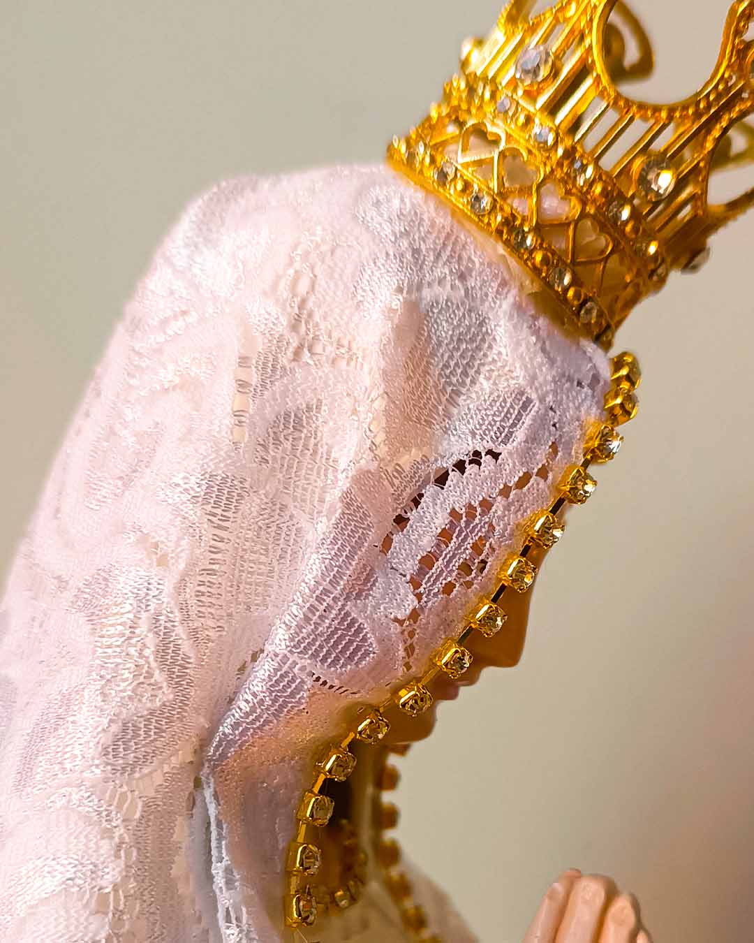 Cada Virgen que pinto y decoro lleva un pedacito de mí. Esta Virgen de Fátima de 48 cm la hice con mucho cariño, aplicando telas, bisutería y detalles que realzan su belleza.
