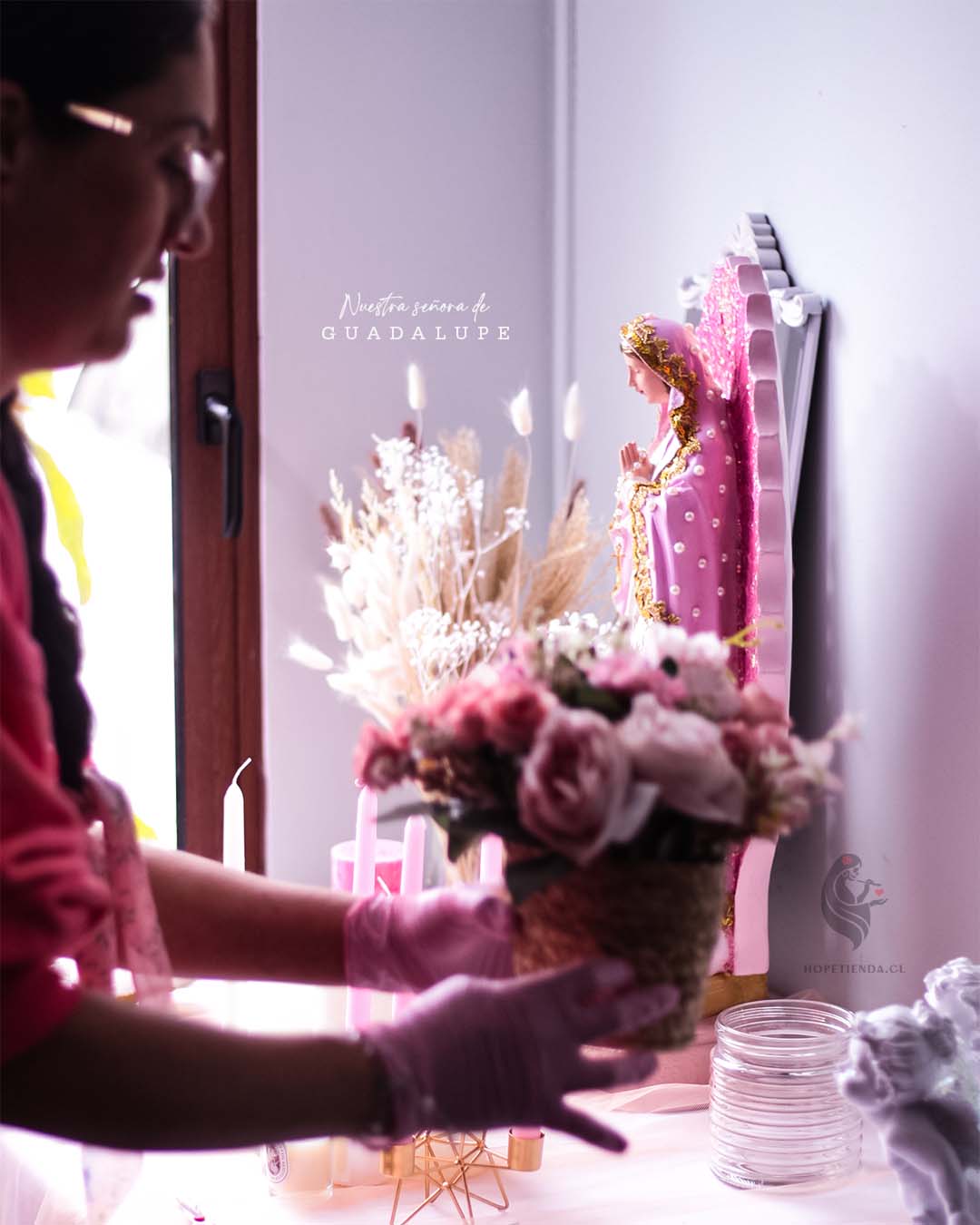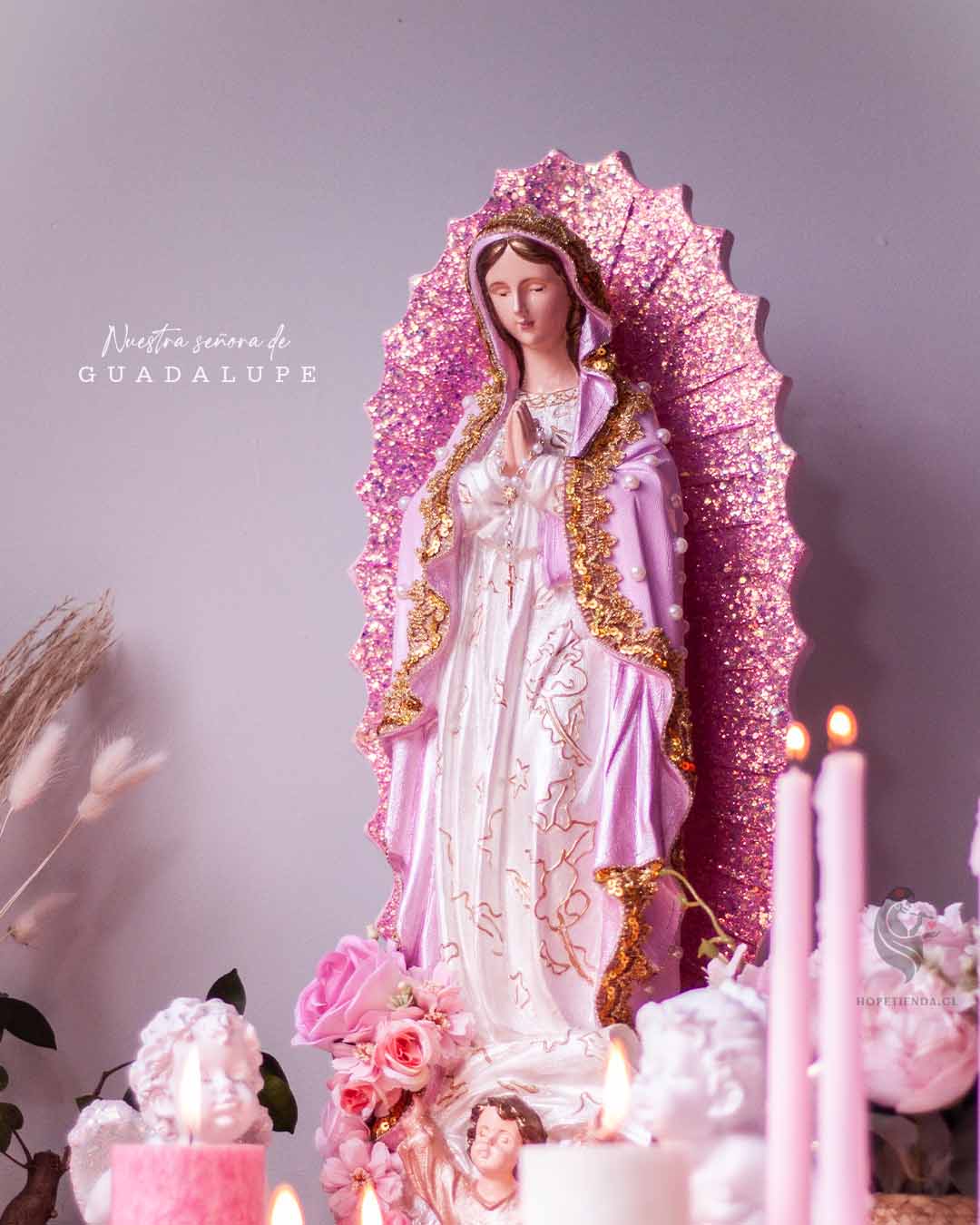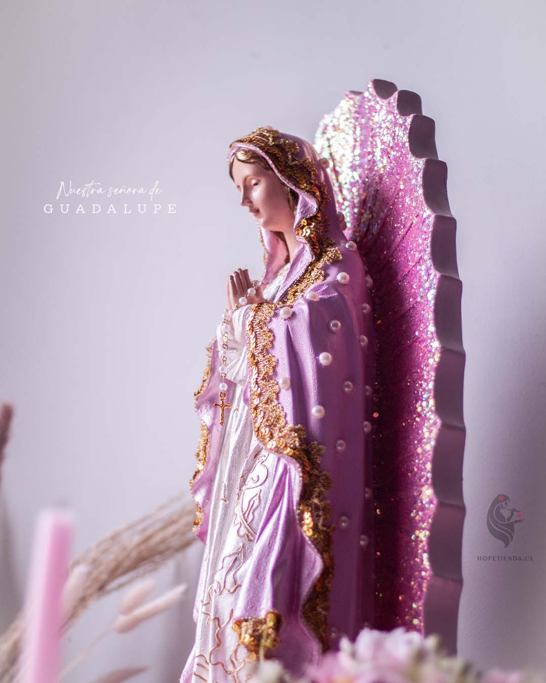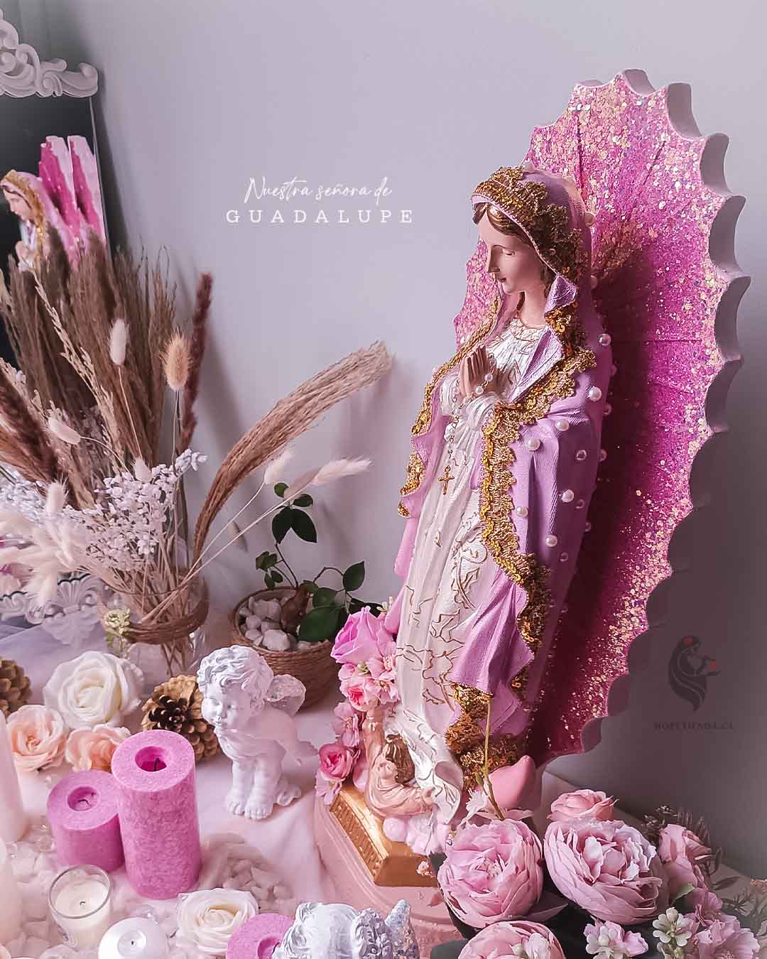 - La aureola de la Virgen esta pintada y bañada en Escarcha rosa de alta calidad marca Gida U.S.A