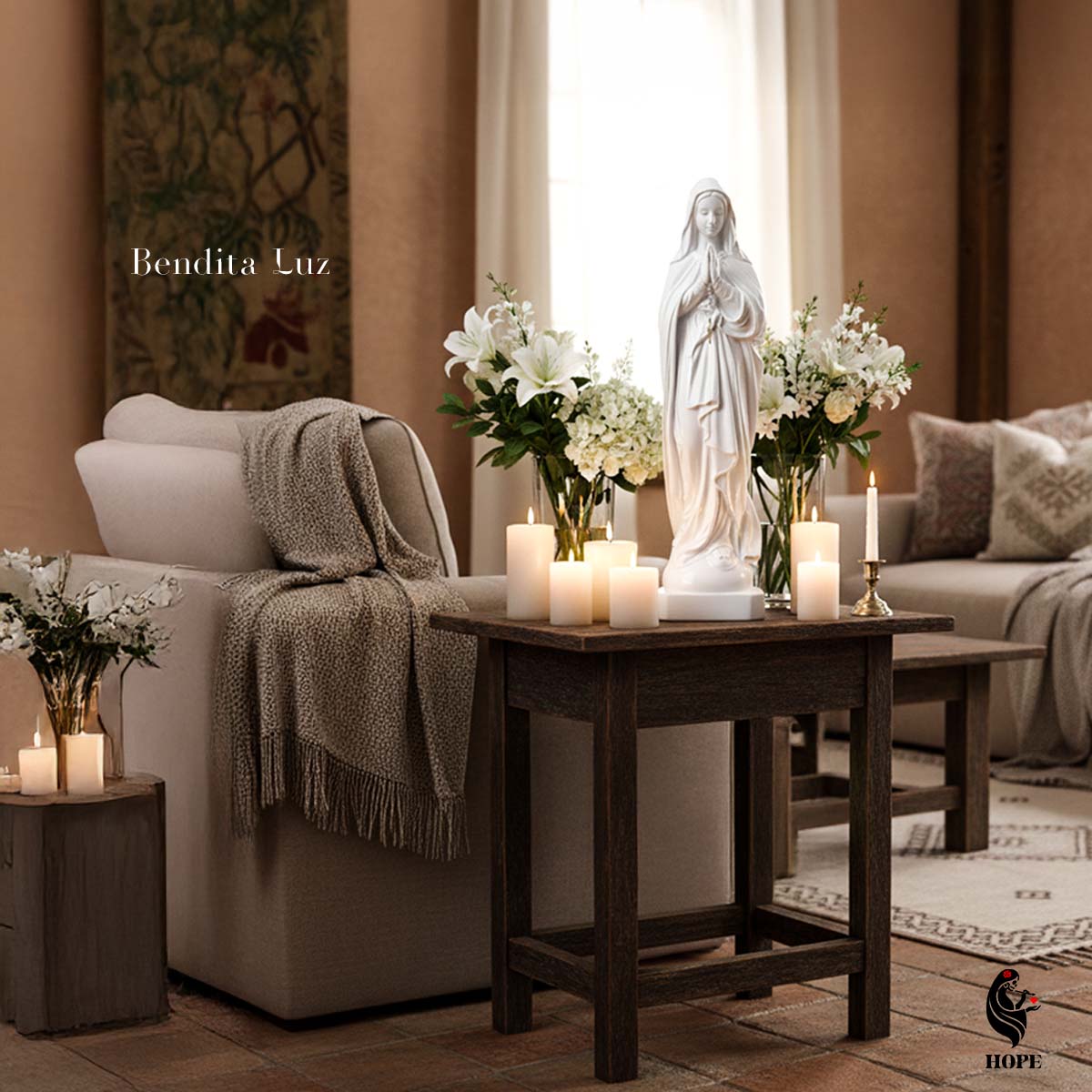 Virgen Maria Rezando con rosario Blanco Brillante